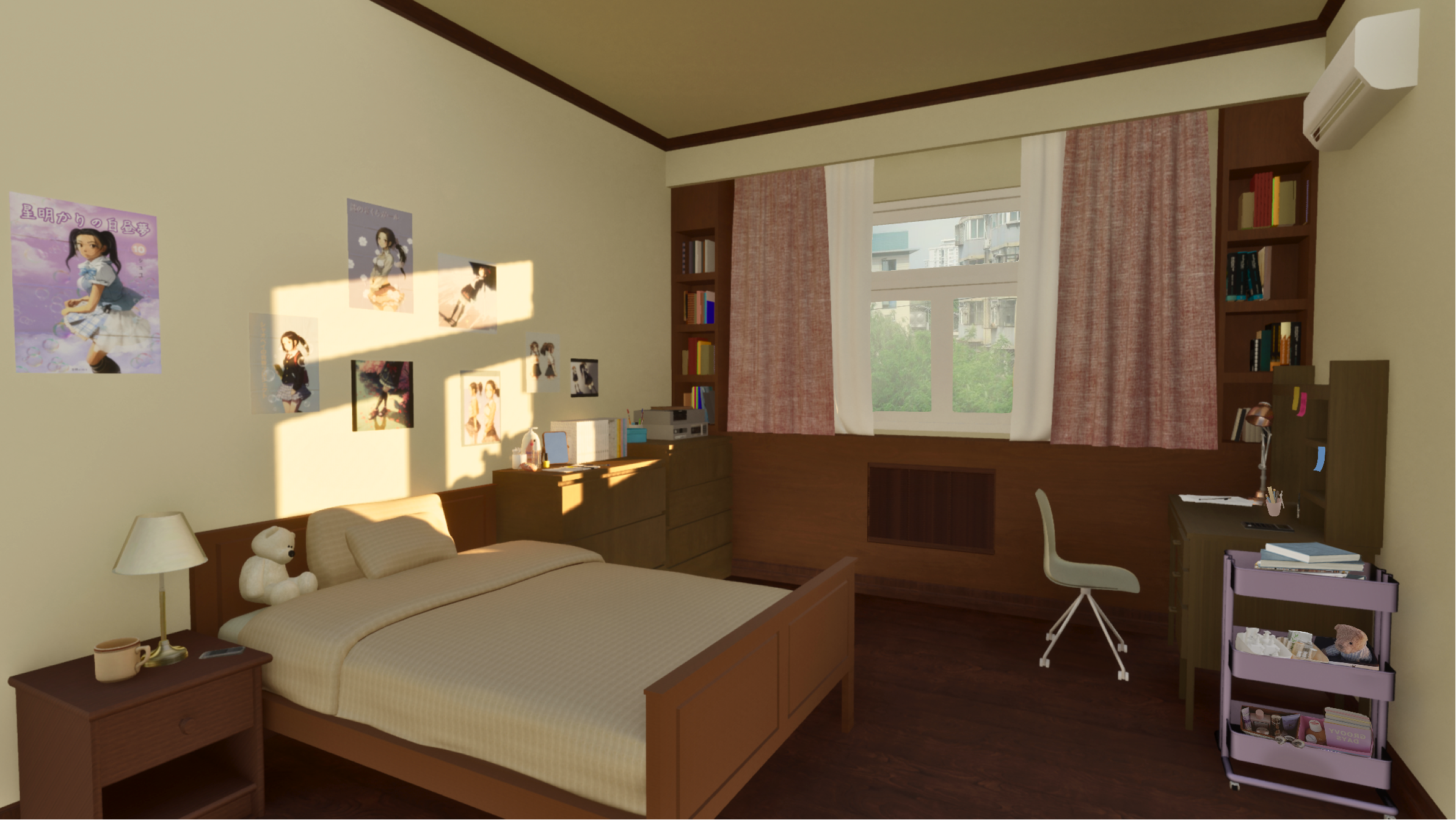 DESIGN IDEAS: Chunxiao is a typical good student in a Chinese middle school who secretly fantasy herself wearing stockings, influenced by Japanese animation. The BOXY design of the built-in furnitures serves as a metaphor representing Chunxiao's entrapment within the rigid Chinese educationa system and the weight of soceital expectiations. Both the window and the door are both imprisoned by the surrounding cabinets, shelves or closet.